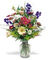 Send the vibrant colors of summer with Delphiniums, Lisianthus, Gerbera Daisies, Bouvardia, Rainbow Aster, Alstroemeria, Daisy Mums and more in a glass vase. Delightful! |